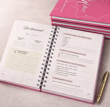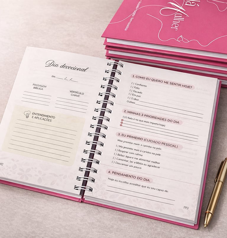 O caderno inclui áreas dedicadas para devocionais, gratidão, reflexões e registros pessoais, tornando-se um lugar íntimo onde você pode escrever sem pressa, sem julgamentos e no seu próprio tempo.